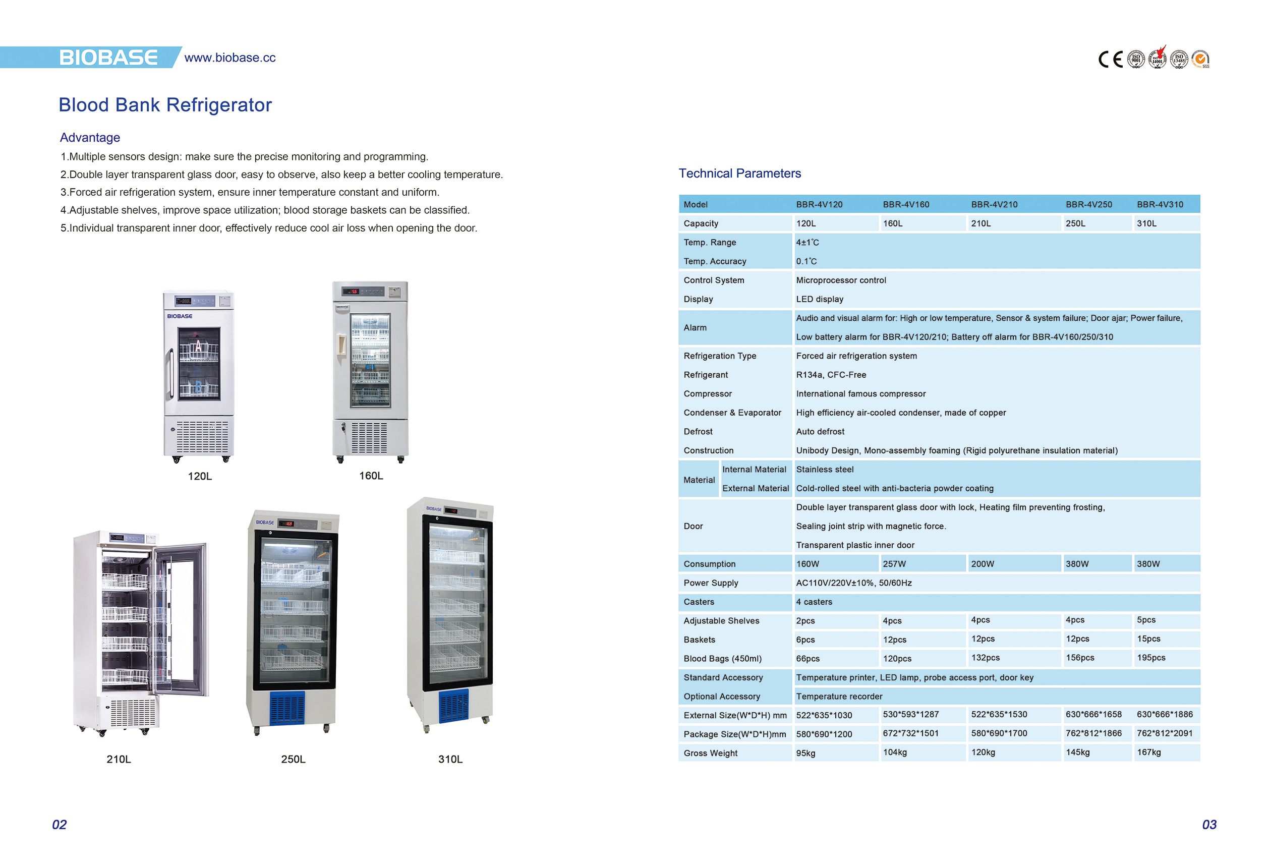 Audio and visual alarm for: High or low temperature, Sensor failure, System failure; Door ajar; Power failure, Low battery alarm for BBR-4V120/210; Battery off alarm for BBR-4V160/250/310 |