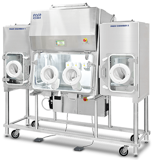 - Ambient air is pulled through the inlet prefilter located on top of the isolator. Air from the top inlet and from work zone is pulled by the fan which creates a positive pressure on the plenum that creates downflow. The HEPA (H14) downflow filter creates a laminar and particle-free ISO Class 5 air cleanliness as per ISO 14644-1 (equivalent to Class 100 as per US Fed Std 209E) inside the isolator to protect the work material inside the main chamber and pass-thru. Air fromthe work zone and pass-thru is quickly purged out by the fan to keep the area clean. The fan pulls approximately 90% of the purged air back to the plenum and after passing through the HEPA (H14) downflow filter.