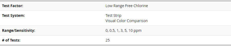 The Insta-TEST® Low Range Chlorine test strips are a convenient way to test low range levels of Free Chlorine. Ideal for drinking water or pools. Range and sensitivity is 0, 0.5, 1, 3, 5, 10 ppm.