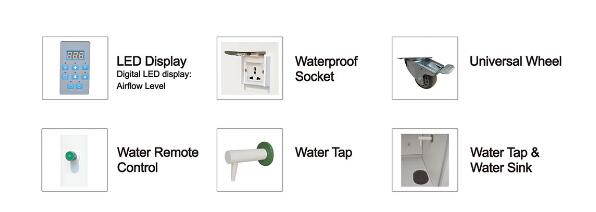 Water tap, Water sink, LED lamp, Total load of 2 waterproof sockets: 500W, Built-in PP blower,