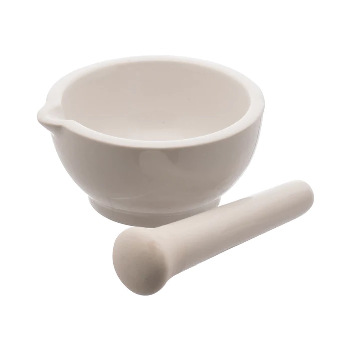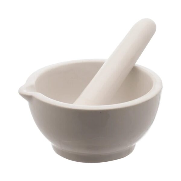 Mortar and pestle, made of porcelain. Glazed surface on the inside and outside. Outer diameter measures 125mm.