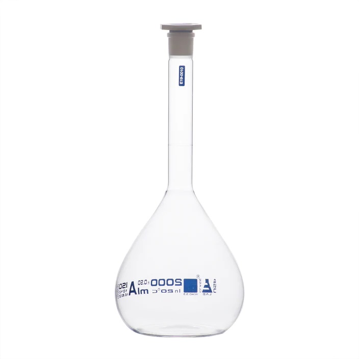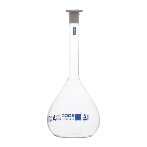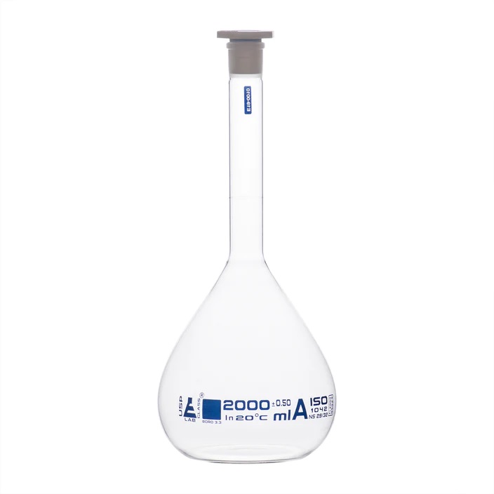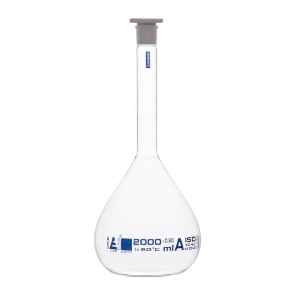Volumetric Flask, 2000ml – Class A, ASTM – Polypropylene Stopper – Blue Graduation – Borosilicate Glass